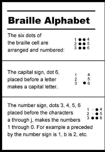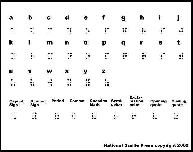 I will also mention some of the lesser used codes, which it helps to have an awareness of, like braille. The following is the braille alphabet: